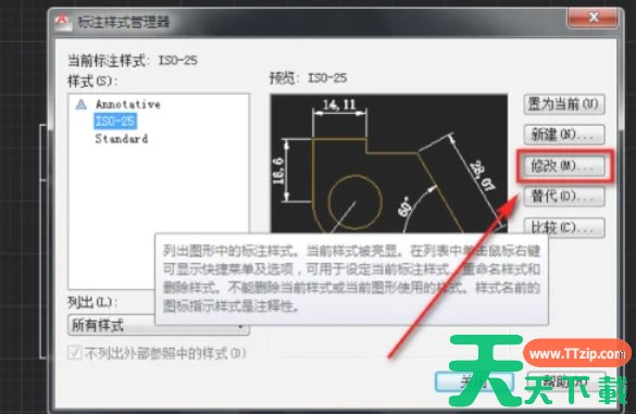 在选定的标注样式下,点击“修改”按钮,进入标注样式修改窗口。