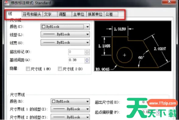 在该窗口中,可以修改标注的文字、线条、箭头等参数,以及标注的尺寸、公差等设置。