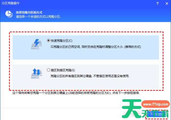 4.设置目标分区:在列表中选择一个合适的分区作为目标,该分区将接收克隆后的数据。选择完毕后,点击“下一步”进行下一步操作。