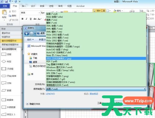 第二步:点击visio 左上角 “文件”-> “另存为”->“保存类型”->“JPEG文件交换格式”->输入图片名字->点击保存,记得存在要求的位置(如图所示)。