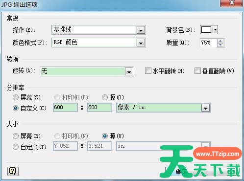 第三步:此时弹出JPG输出选项,对分辨率自定义为 600,600,点击确定(如图所示)。