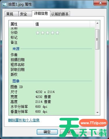 第五步:打开图片,右击“属性”,可以看到详细信息里面显示了图片的水平和垂直分辨率均为 600dpi(如图所示)。