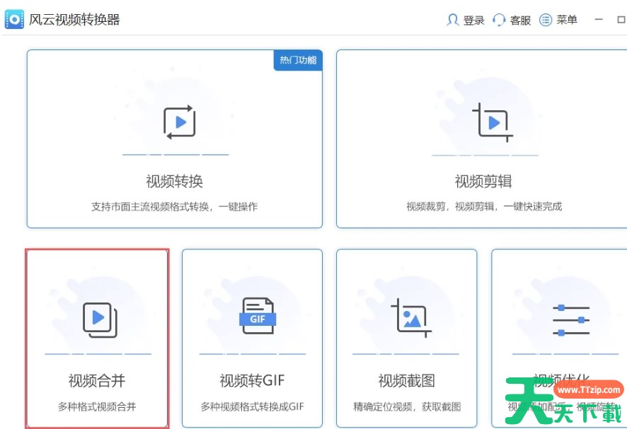 风云视频转换器支持常用视频格式互相转换,视频合并、视频分割、转GIF,可调节分辨率、比特率、帧数、编码格式等。那么风云视频转换器怎么合并视频?风云视频转换器合并视频的方法?下面就让天天下载Ttzip给大家解答下吧!