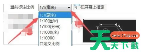 在“标注设置”窗口中,找到“当前标注比例”按钮。点击该按钮后,会弹出一个比例选择栏目。在这个栏目中,可以选择适合自己作图习惯的标注比例,例如“1:1(毫米)”。如果需要其他比例,可以点击下拉箭头选择其他合适的比例。