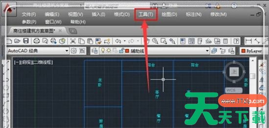 1.打开cad图形,在菜单栏,点击“工具”;