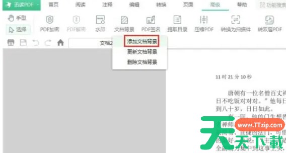 在菜单栏中找到“高级”选项,并点击进入。在“高级”菜单下,选择“文档背景--添加文档背景”选项。