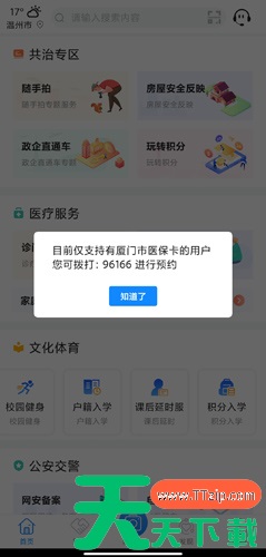 1、用户在首页中点击挂号预约按钮; 2、该软件仅支持有厦门医保卡的用户,没有的话可以拨打电话96166进行预约。 @天天资源网TTzip 除特别注明外,本站所有文章均为 天天下载 原创,转载请注明出处来自 https://www.ttzip.com/209958.html