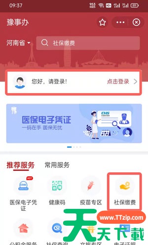 3、在豫事办小程序,先点击【点击登录】登录你的个人账号,然后点击【社保缴费】服务;