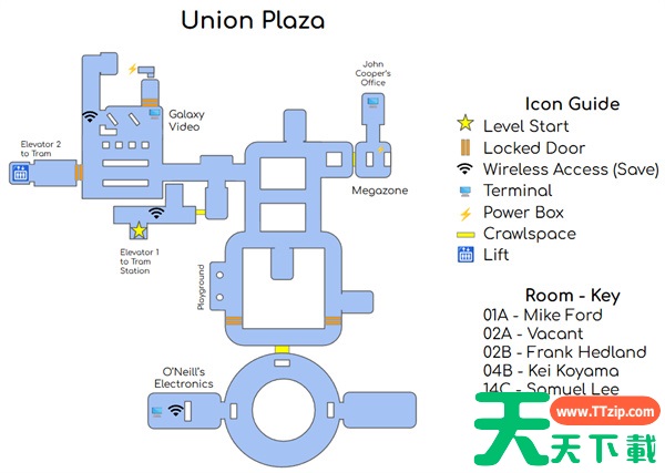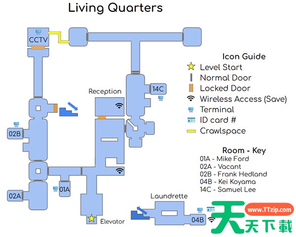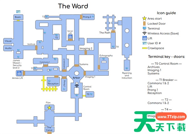 它们不是完全按比例排列,但有方向性,并且能与其他地图和区域连接。这些地图包括锁门和终端位置、区域名称和门禁卡位置,但略过了一些过渡地图。