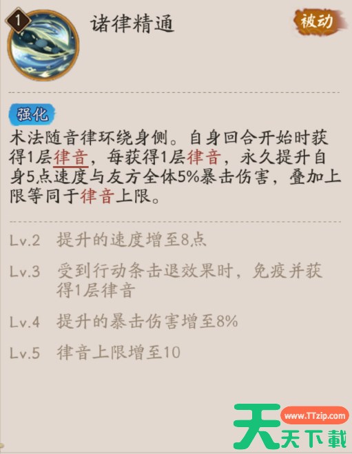 术法随音律环绕身侧。自身回合开始时获得1层律音,每获得1层律音,永久提升自身5点速度与友方全体5%暴击伤害,叠加上限等同于律音上限。
