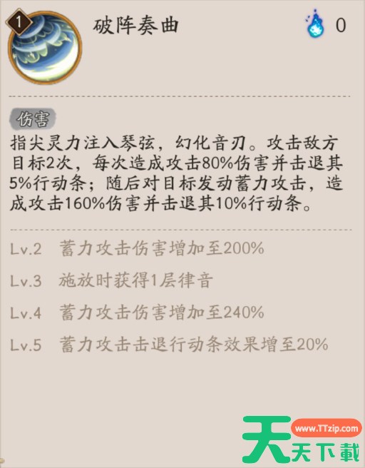 指尖灵力注入琴弦,幻化音刃。攻击敌方目标2次,每次造成攻击80%伤害并击退其5%行动条;随后对目标发动蓄力攻击,造成攻击160%伤害并击退其10%行动条。