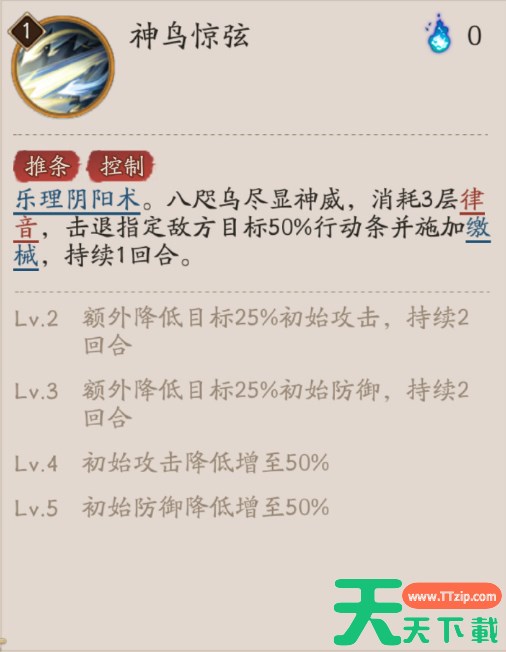 乐理阴阳术。八咫乌尽显神威,消耗3层律音,击退指定敌方目标50%行动条并施加缴械,持续1回合。