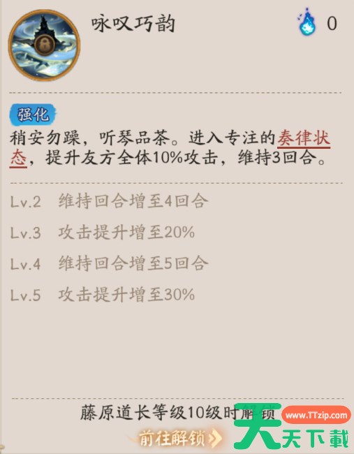 稍安勿躁,听琴品茶。进入专注的奏律状态,提升友方全体10%攻击,维持3回合。