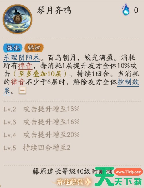 乐理阴阳术。百鸟朝月,皎光满盈。消耗所有律音,每消耗1层提升友方全体10%攻击(至多叠加10层),持续1回合。当消耗的律音不少于6层时,解除友方全体控制效果。