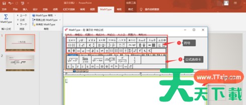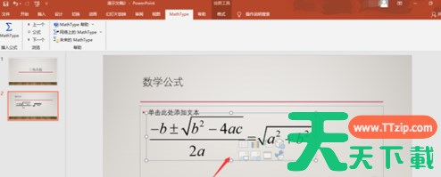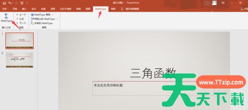 MathType是一款由Design Science公司开发的专业的数学公式编辑器,广泛应用于各种文档处理和出版工作中,特别是在编辑数学试卷、书籍、报刊、论文以及幻灯演示等文档时,能够轻松输入各种复杂的数学公式和符号。下文天天下载Ttzip就为大伙带来了MathType为ppt演示文稿添加公式的方法,让我们一起来下文看看吧。