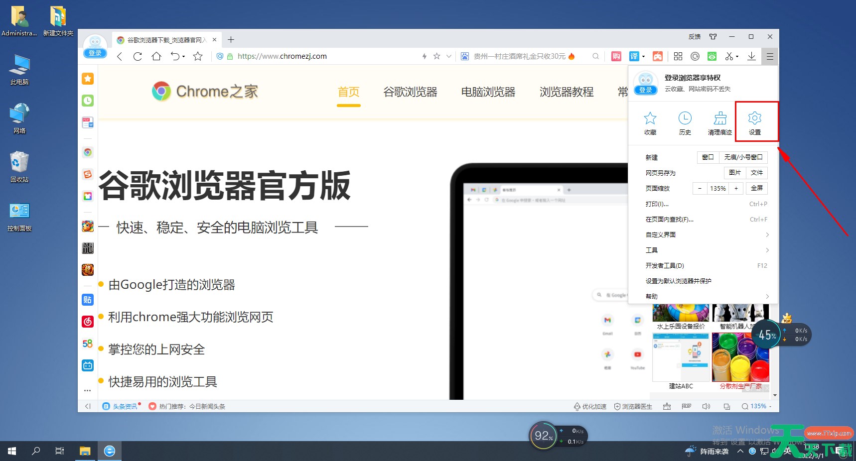 2、点击之后下方会弹出2345浏览器菜单窗口,在窗口中可以看到“设置”选项,点击打开设置页面。