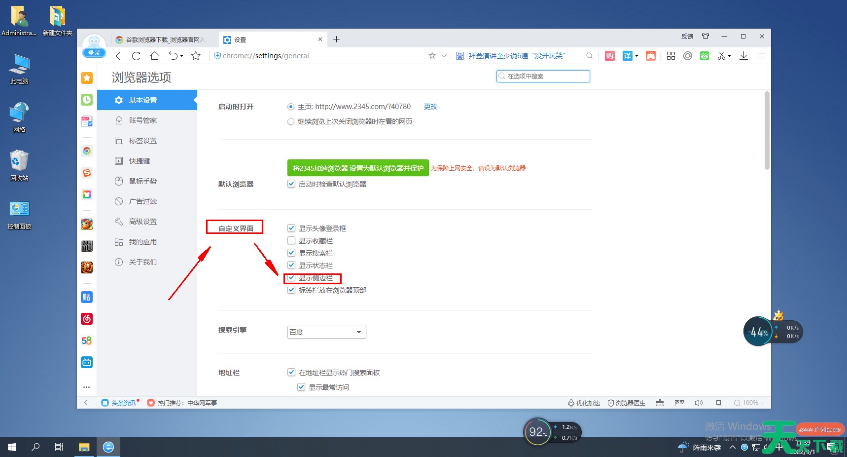 3、这时会进入2345浏览器基本设置页面,在该页面中可以找到“自定义界面”这一栏,将“显示侧边栏”点击勾选起来就可以了。