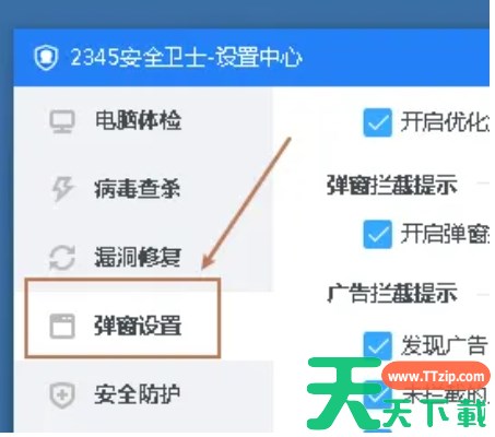 2、在设置中心页面,找到并点击左侧的“弹窗设置”选项卡。