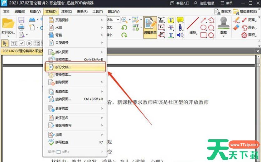 迅捷pdf编辑器是一个操作简单、功能强大的PDF编辑器,那么迅捷pdf编辑器怎么拆分页面?迅捷pdf编辑器拆分页面的方法?下面就让天天下载Ttzip给大家解答下吧! 迅捷pdf编辑器怎么拆分页面? 1、运行迅捷pdf编辑器,点击“打开”选项,选择需要拆分的PDF文件并将其导入到软件中。 2、在PDF文件打开之后,点击软件上方的“文档”选项,在下拉菜单中,选择“拆分页面”功能。 3、根据需要选择合适的拆分方式后点击确定即可。 以上就是天天下载Ttzip为您整理的迅捷pdf编辑器怎么拆分页面?迅捷pdf编辑器拆分页面的方法啦,希望能帮到您。 除特别注明外,本站所有文章均为 天天下载 原创,转载请注明出处来自 https://www.ttzip.com/210408.html