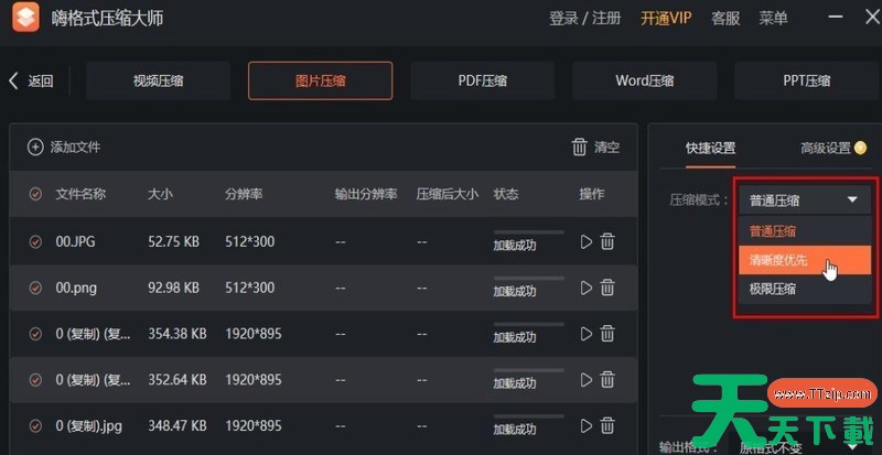 3、点击添加好想要压缩的图片文件之后,在界面右边的压缩模式中,点击下拉列表可以选择想要使用的压缩模式。