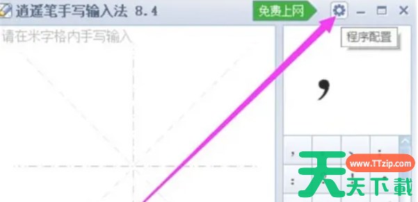 在逍遥笔手写输入法窗口中,单击窗口顶部右侧的【程序配置】选项,以打开配置窗口。