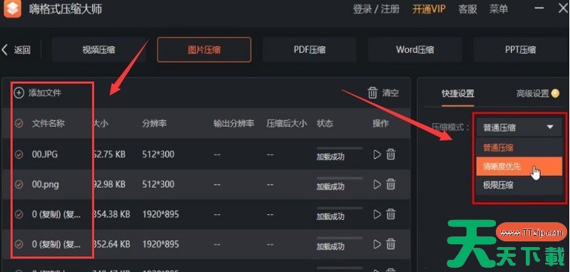 1.打开界面后,从图片库中添加需要压缩的素材文件,并将右侧的压缩模式设置为清晰度优先