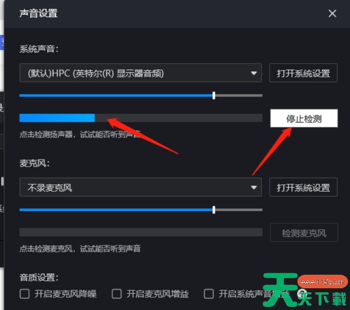4.进入之后,点击【系统声音】下的【停止检测】按钮,对系统声音进行检测一下,看看系统声音是否正常使用。