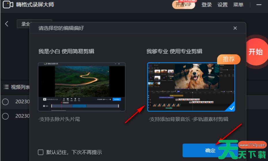 3、第三步,点击剪辑选项之后页面中会出现一个剪辑偏好弹框,选择自己需要的剪辑模式,然后点击“确定”选项,点击该选项之后会自动下载安装嗨格式剪辑大师