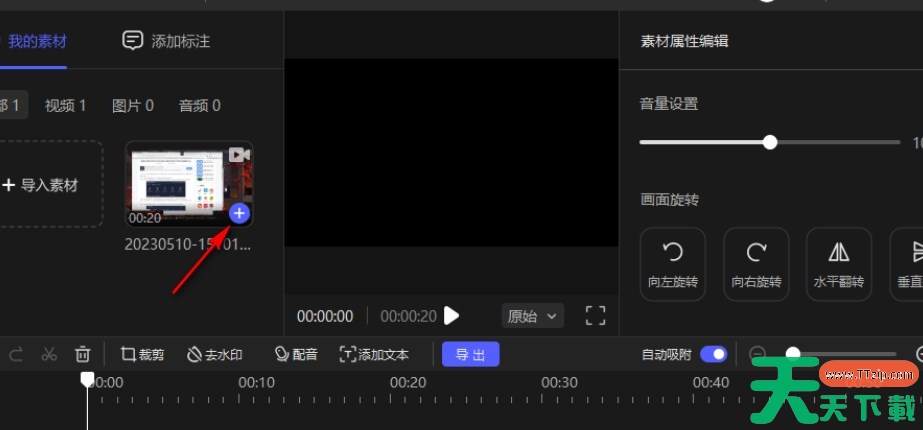 4、第四步,安装好剪辑大师之后,我们进入剪辑页面,在该页面中我们点击选中的视频段落右侧的“+”图标,将其放入轨道中