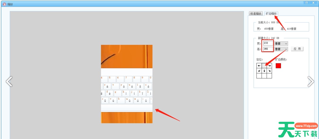扩边缩放:如果需要在保持图片宽高比的同时,增加或减少图片的边框,可以选择“扩边缩放”选项。在这里可以设置边框的宽度、高度以及颜色等参数。