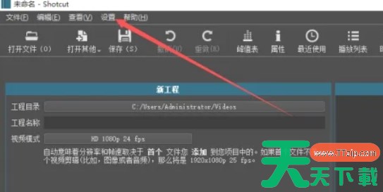 在Shotcut软件的主界面中,找到并点击页面顶部菜单栏中的“设置”选项。