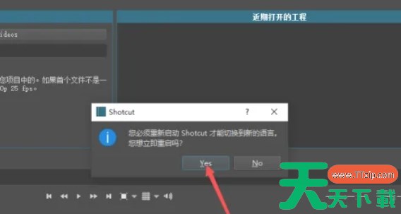 选择完语言后,Shotcut会弹出一个对话框,提示需要重启软件才能使语言设置生效。此时,点击“Yes”按钮或类似的确认按钮,重启Shotcut软件。