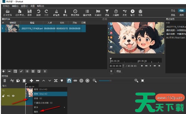 使用鼠标右键点击视频轨道上的视频素材,会弹出一个菜单选项。在菜单选项中选择【属性】,这时会在左侧窗口中弹出一个设置窗口。