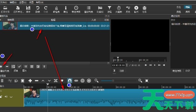 点击页面上的【+】图标,将视频添加到上方的播放列表中。将播放列表中的视频拖动到下方的视频轨道上,以便进行编辑。