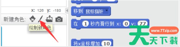 4、绘制完成之后,我们需要给这个角色进行程序的设置,点击选中角色,然后点击工具栏上的脚本按钮,设置图中所示程序,首先需要进行起始位置的定位,然后要求背景铺满,坐标开始变化。