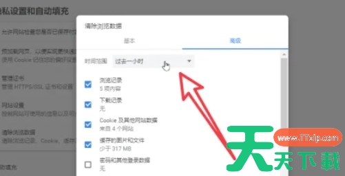 除了时间范围外,你还可以选择要清除的数据类型。例如,你可以勾选“浏览历史”、“下载记录”、“Cookies及其他网站数据”等选项,以清除这些类型的数据。