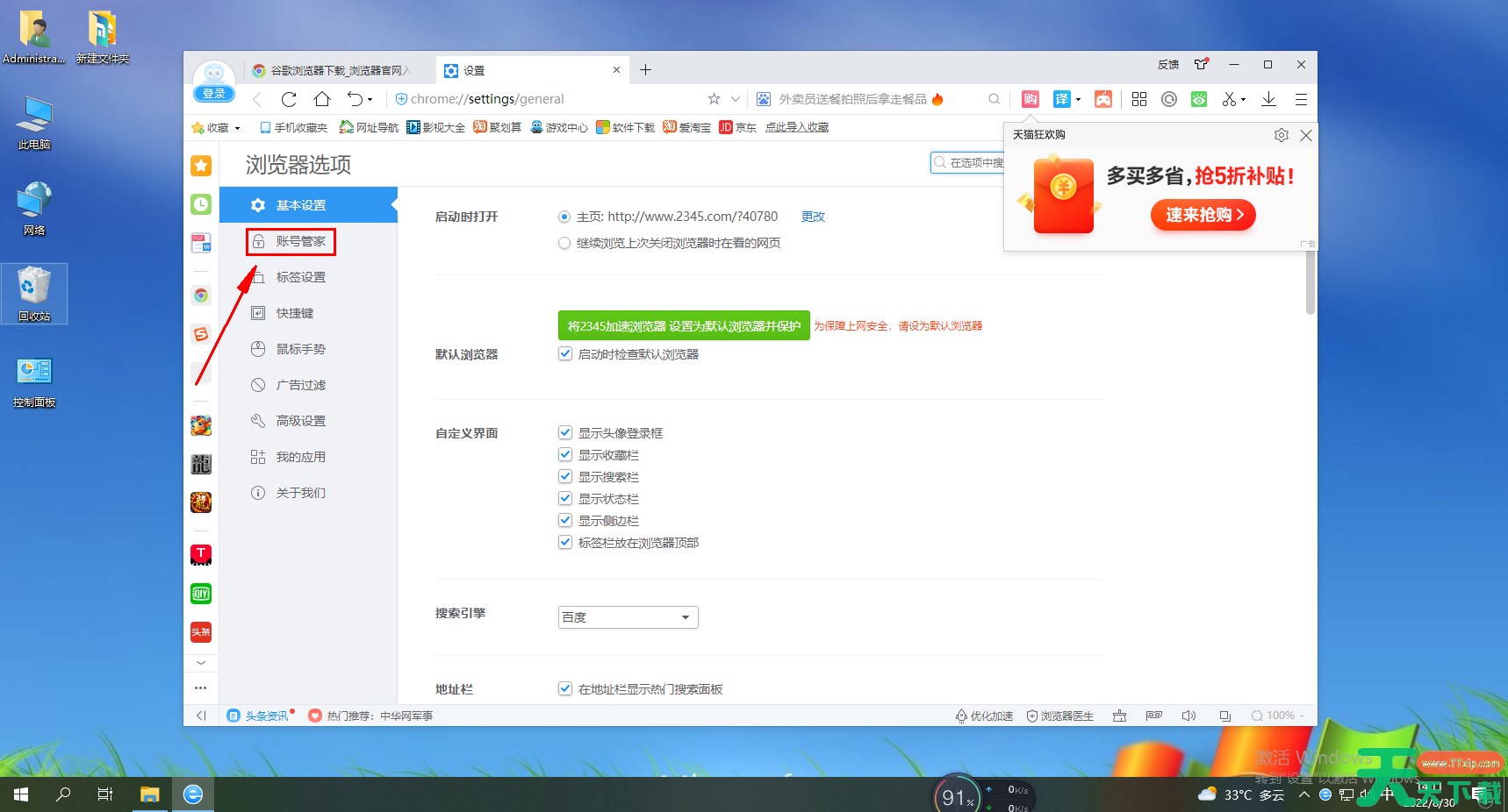 3、进入2345浏览器的设置页面后,在页面左侧的菜单栏中点击切换到“账号管家”页面。