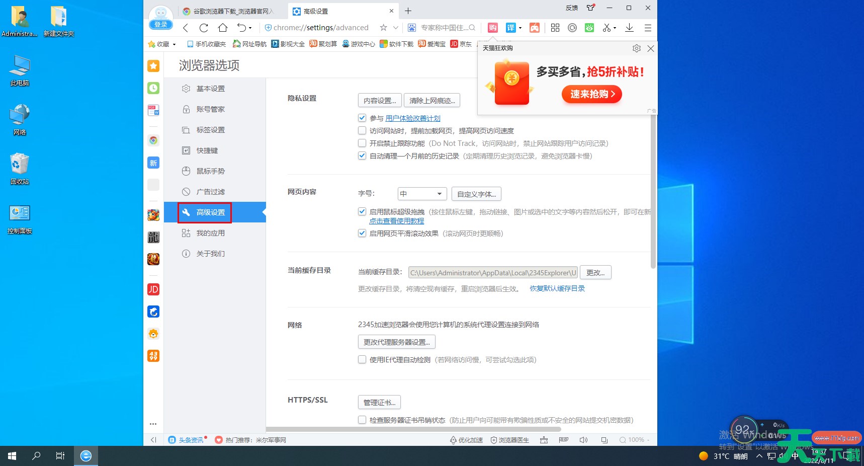 3、这时我们就会进入2345浏览器的设置页面,在页面左侧的菜单中可以看到“高级设置”这一项,点击打开它。