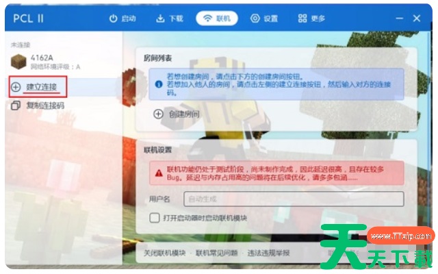 1、打开pcl2启动器,点击顶部联机频道,再点击左侧的【建立连接】。