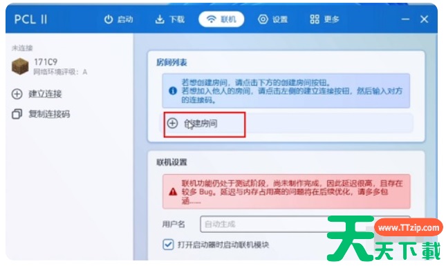 1、打开pcl2启动器,点击顶部联机项目,再点击右侧的【创建房间】。
