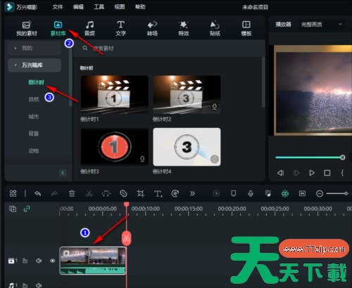 一、首先打开软件,导入视频素材。将视频素材直接拖放到下方的轨道。然后点击上方工具栏中的【素材库】,在左侧列表中选择【倒计时】素材。
