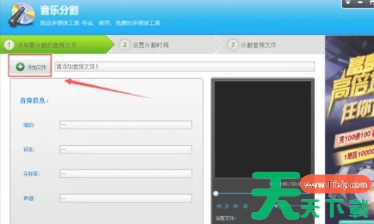 在音乐分割工具的界面中,点击“添加文件”按钮,从文件浏览器中选择你想要分割的音频文件,并将其添加到工具中。