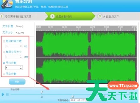 平均将文件分割为几段:你可以选择将音频文件平均分割为指定的段数。