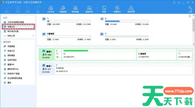 1.在软件界面的左侧看到一个“恢复分区”的选项,点击进入。