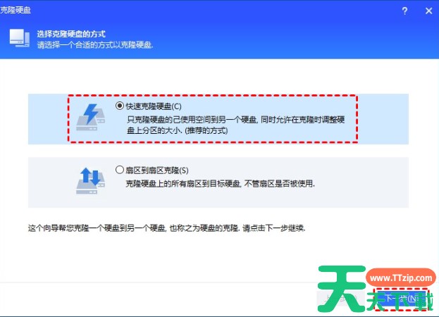 同样地,在列表中选择您想要作为克隆目标的硬盘,并再次点击“下一步”以确认选择。