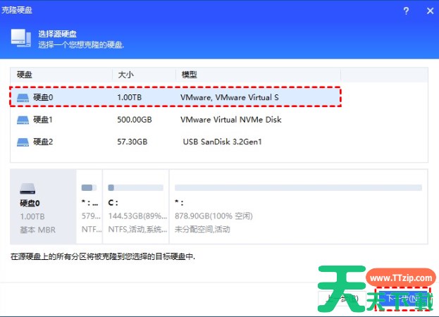 在提供的硬盘列表中,找到并选中您想要克隆的硬盘作为源硬盘。之后,点击“下一步”继续操作。