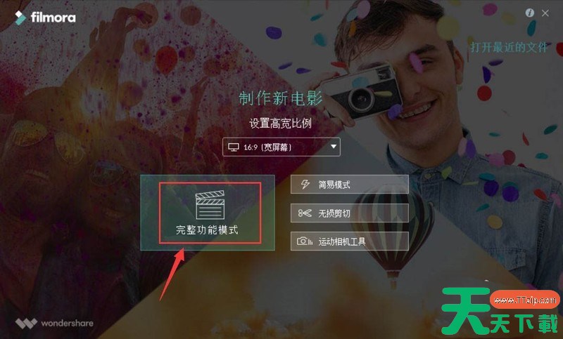打开filmora,选择【完整功能模式】。