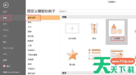 打开亿图图示专家软件。选择“新建”-“基本绘图”-“2D框图”,然后双击模板中的2D框图模板进入绘图区域。