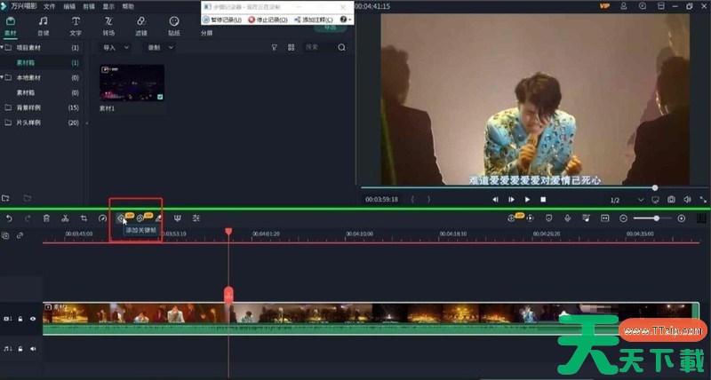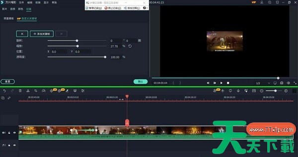 如图天天下载Ttzip选用了三处关键帧,调节了画面缩放,使视频达到先缩后放的效果。还加入了旋转圈数,使画面运动。