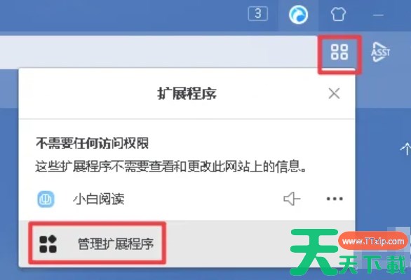 小白浏览器的使用环境十分干净,用户可以同时进行分屏浏览查看,大大地提升浏览的效率,那么小白浏览器怎么移除扩展程序?小白浏览器移除扩展程序的方法?下面就让天天下载Ttzip给大家解答下吧! 小白浏览器怎么移除扩展程序? 1、点击浏览器右上角的小方块扩展程序图标,在弹出的菜单或界面中,选择“管理扩展程序”的选项。 2、找到你想要移除的扩展程序,并点击其旁边的“移除”按钮即可。 以上就是天天下载Ttzip为您整理的小白浏览器怎么移除扩展程序?小白浏览器移除扩展程序的方法啦,希望能帮到您。 除特别注明外,本站所有文章均为 天天下载 原创,转载请注明出处来自 https://www.ttzip.com/210703.html